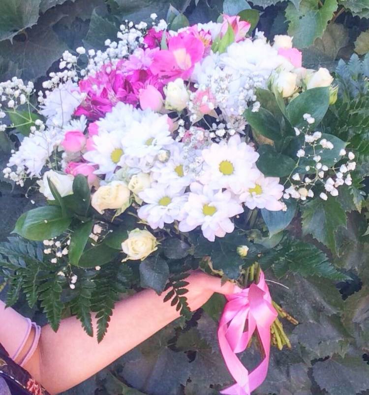 Ни одна юная девушка не сможет не оценить нежную композицию из хризантем. Утонченный комплект сочетает в себе ромашковые хризантемы и розовые альстромерии. Особого изящества придают кустовые розы, которые подчеркнут чистоту намерений. Букет поможет привлечь внимание понравившейся девушки на первом свидании и попросить прощения у любимой женщины.
